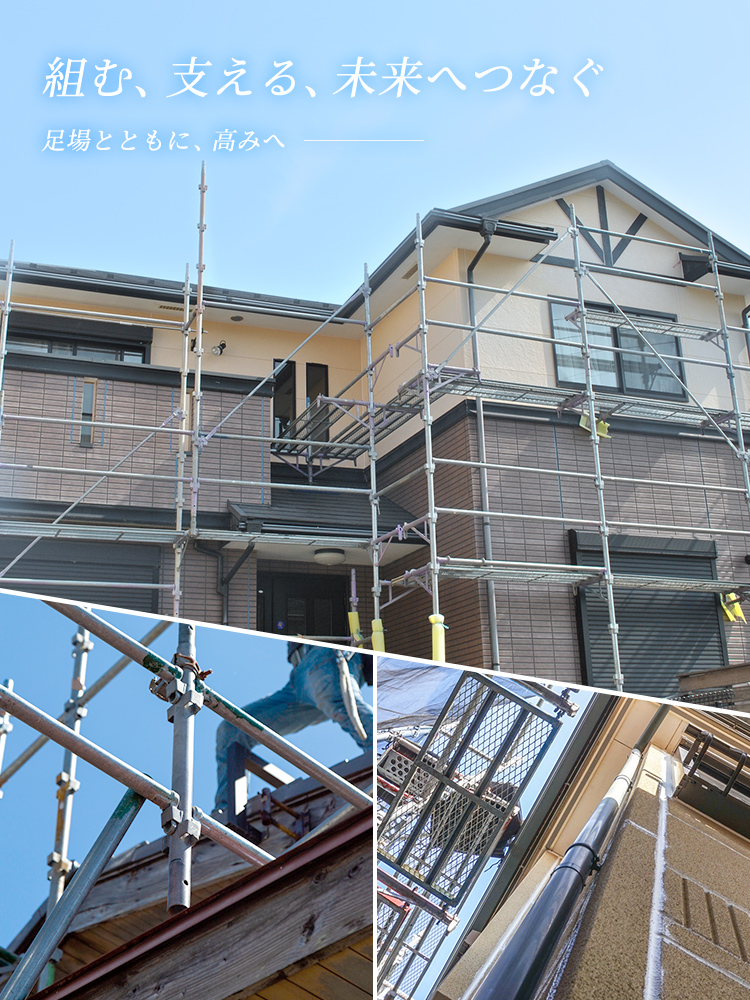 上記の種類の足場工事を行います。 足場は、高所で作業を行う作業者の安心・安全のために必要不可欠な工事です。